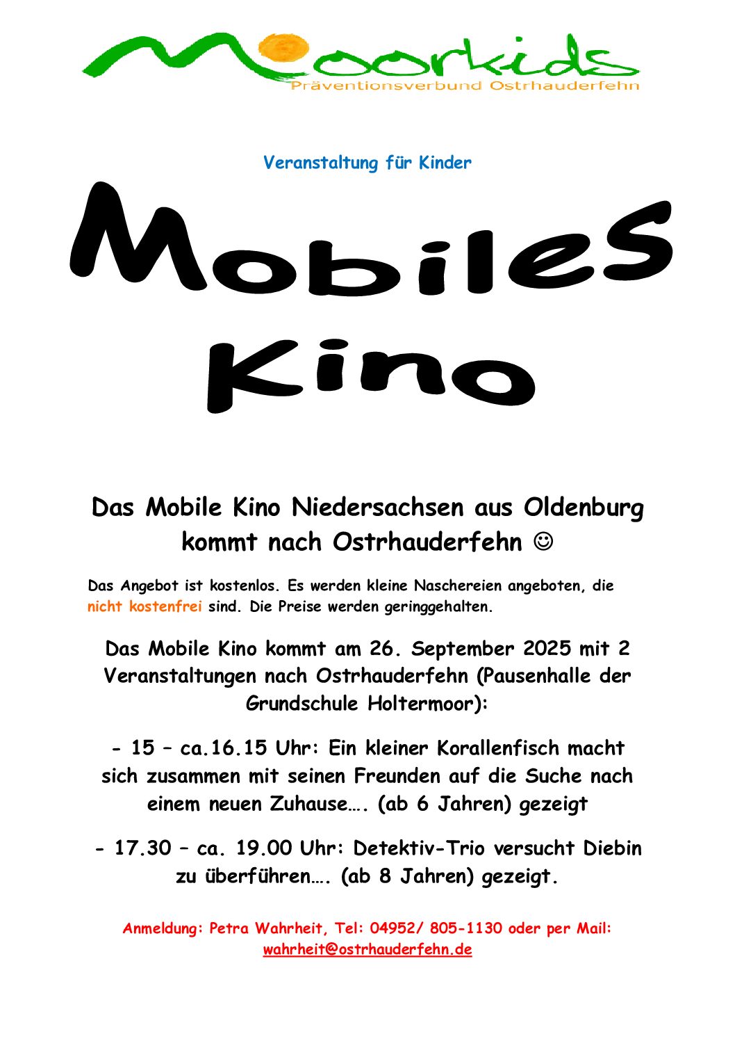 26. September 2025 mit 2 Veranstaltungen nach Ostrhauderfehn (Pausenhalle der Grundschule Holtermoor): 15.00 Uhr für Kinder ab 6 Jahren und 17.30 Uhr wird ein Film für Kinder ab 8 Jahren gezeigt.